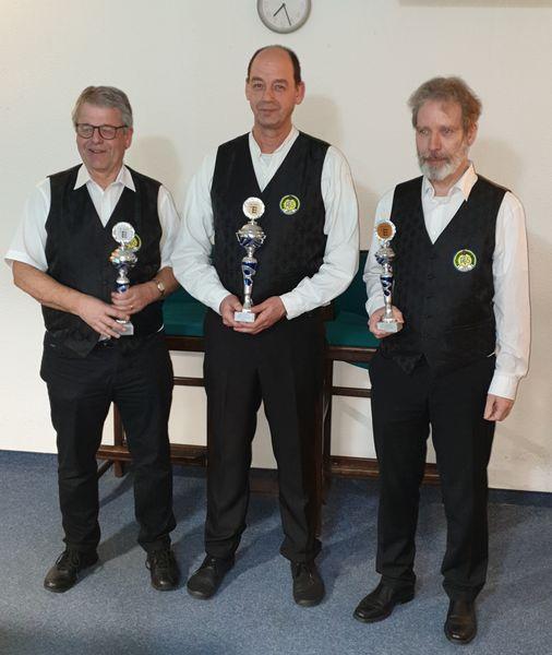 Die Entscheidung um Platz drei fiel ebenfalls in der letzten Spielrunde. Alle drei verbliebenen Teilnehmer hatten noch die Chance aufs Podest. Während Peter Reinhard (Viernheim) nach vier Partien und einem Sieg die letzte Partie als Zuschauer verfolgen musste, traten Ralf Kurz (PTSV Jahn) mit einem Sieg aus drei Partien und Rainer Zottmaier (Stuttgart) noch ohne Sieg aus drei Partien gegeneinander an. Nach einem holprigen Start setzte sich Ralf Kurz am Ende deutlich mit 78 zu 34 Points durch und sicherte mit seinem zweiten Sieg aus vier Partien dem PTSV Jahn den Dreifach-Triumph.