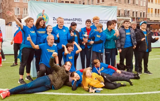 Doch damit nicht genug: Am Wochenende beteiligten sich die Inklusions-Kickers zum fünften Mal in Folge und als einziges Team aus Südbaden, auch an den bundesweiten „Tagen der Fußball- Inklusions“ des DFB und den DFB-Stiftungen: 2025 erstmals auf dem Nürnberger Hauptmarkt. Dort erreichte man im Beisein von Fußball-Weltmeister und DFB-Sportdirektor Rudi Völler einen mehr als achtbaren sechsten Platz. Vom SBFV begleitete Bruno Trenkle (Staffelleiter der Inklusions-Liga) den 30-köpfigen Tross nach Franken.