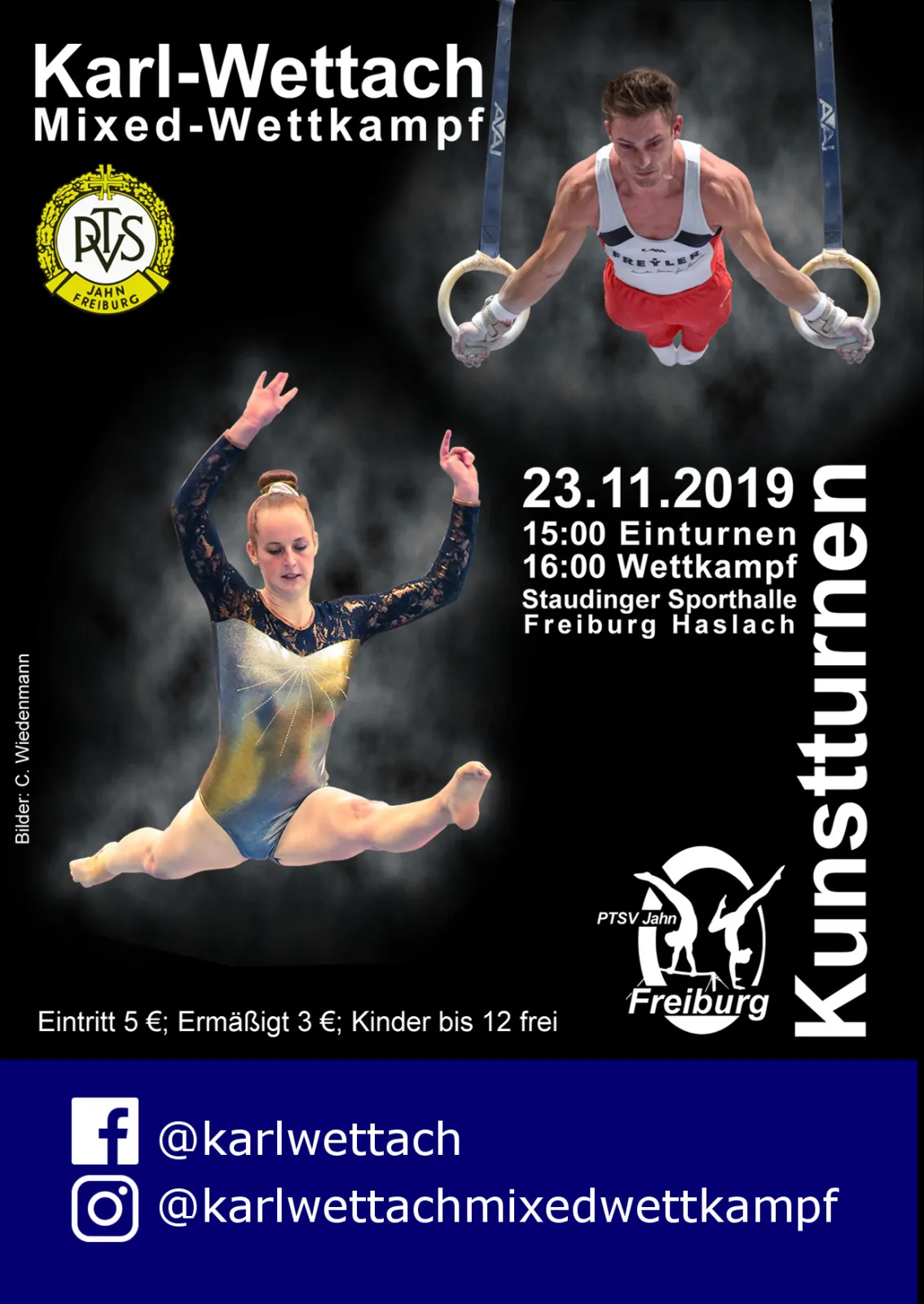 Auch 2019 findet in Freiburg wieder der traditionelle Karl-Wettach Mixed Turn-Wettkampf statt. Am 23. November messen 12 Turnpaare ihre Kräfte in der Staudinger-Halle in Freiburg. Der traditionsreiche Wettkampf, welcher die letzten Jahre immer im September stattfand, zieht auch dieses Jahr überregionale Turngrößen an und verspricht den Zuschauern ein spannendes Turn-Highlight auf hohem Niveau.