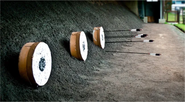 Wenn du auf der Suche nach Bogen-Action im Format von Legolas oder Katniss Everdeen bist, könntest du von Kyudo etwas enttäuscht werden. Weil unser japanischer Bogen äußerst eigensinnig ist, werden die Bewegungsabläufe zunächst mit einem Übungsgerät simuliert. So kann das Verletzungsrisiko für Laien (und ihre Umgebung) minimiert werden. Ist die grundlegende Bewegung verinnerlicht, wird die Ausbildung mit dem Bogen an einer Reisstrohrolle, der Makiwara, fortgeführt. Ist die Schusstechnik schließlich gefestigt, geht es ans Mato, die 28m entfernte Zielscheibe, wo die Bogen-Action beginnen kann.
