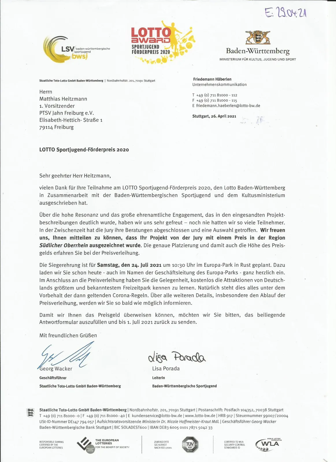 Unsere eingereichten Projekte für den LOTTO Sportjugend-Förderpreis 2020 sind von der Jury mit einem Preis in der Region Südlicher Oberrhein ausgezeichnet worden. Die genaue Platzierung erfahren wir bei der Preisverleihung am 24.07.21 im Europa Park Rust.