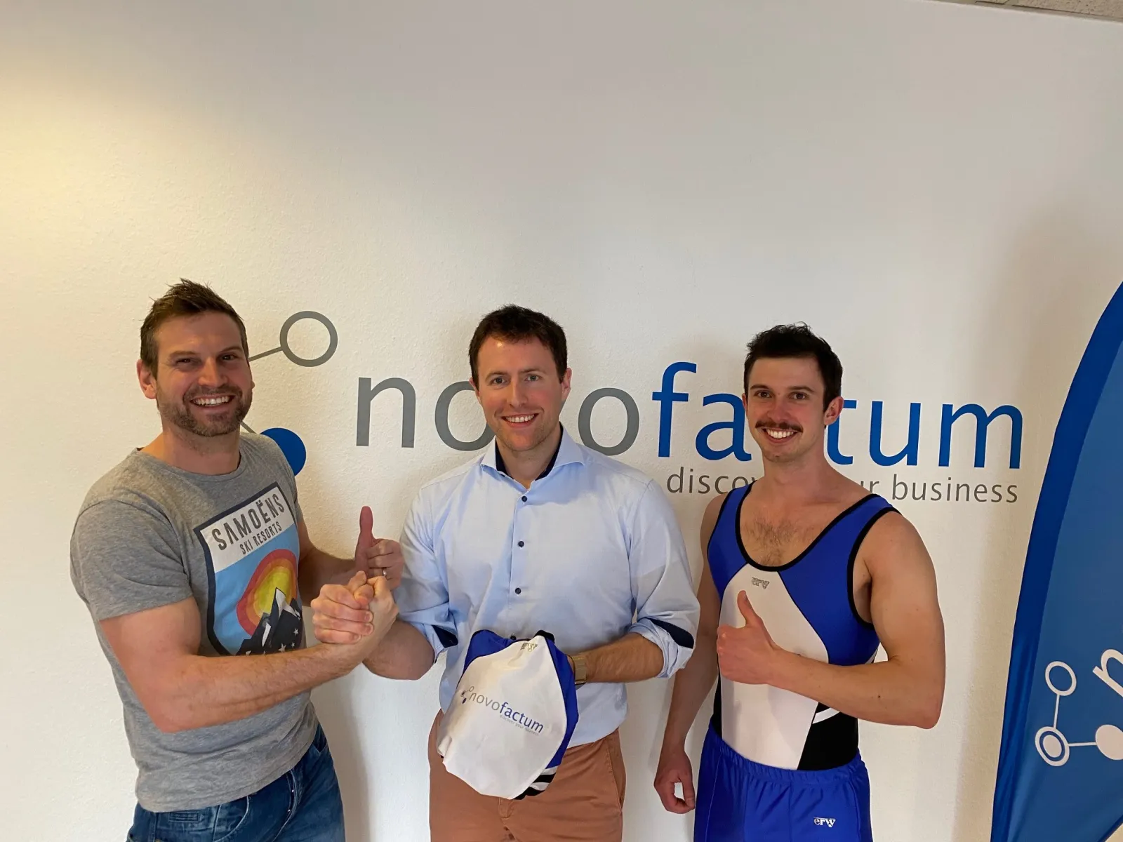 Pünktlich zum Saisonstart der Oberliga-Kunstturner konnte PTSV-Coach Bernd Seifried gemeinsam mit Oberligaturner Felix Schickendanz die neuen Trikots in den Büroräumen der Novofactum GmbH entgegennehmen. Christian Riffner, Geschäftsführer der Novofactum GmbH, letztjähriger Verbandsligameister und Aufsteiger weiß sehr wohl um den Motivationsanschub der neuen Trikots. Nach Jahren des Trikots tauschen während dem Wettkampf können sich die Kunstturner – dieses Jahr wieder mit der WKG Freiburg/Breisgau – voll und ganz auf Ihre Übungen konzentrieren.