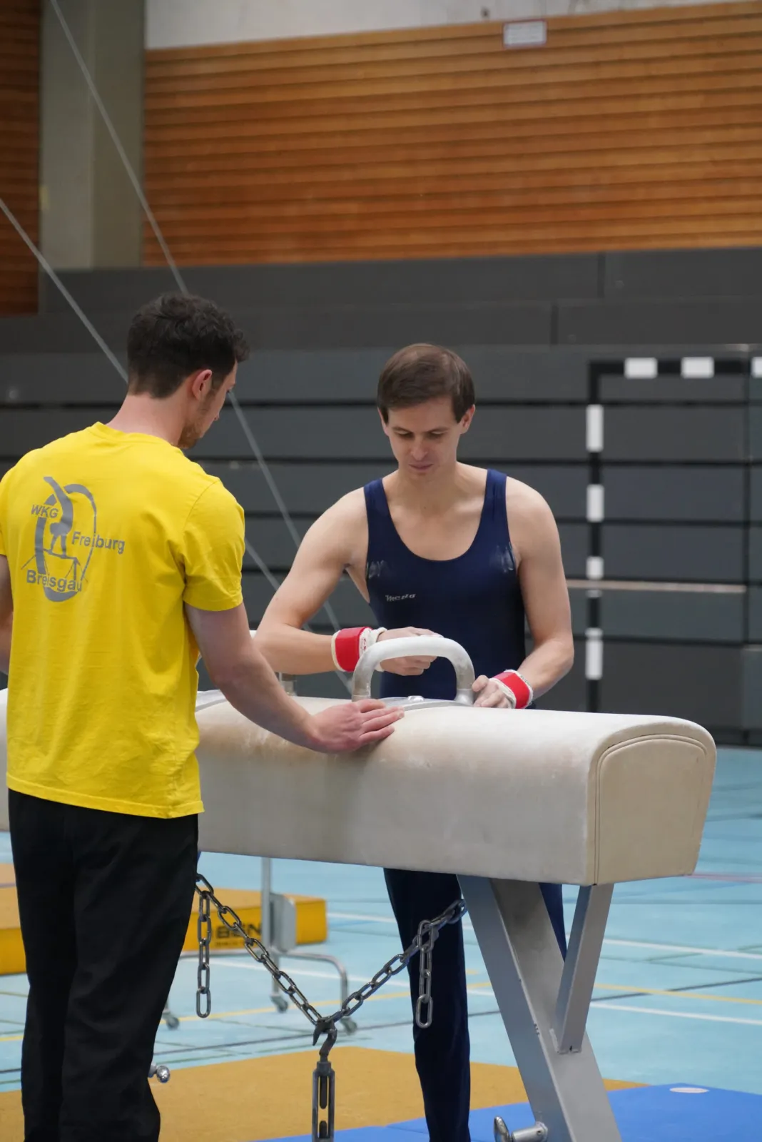 Felix Schickendanz und Markus Mauck nehmen Maß am Zittergerät: Pauschenpferd