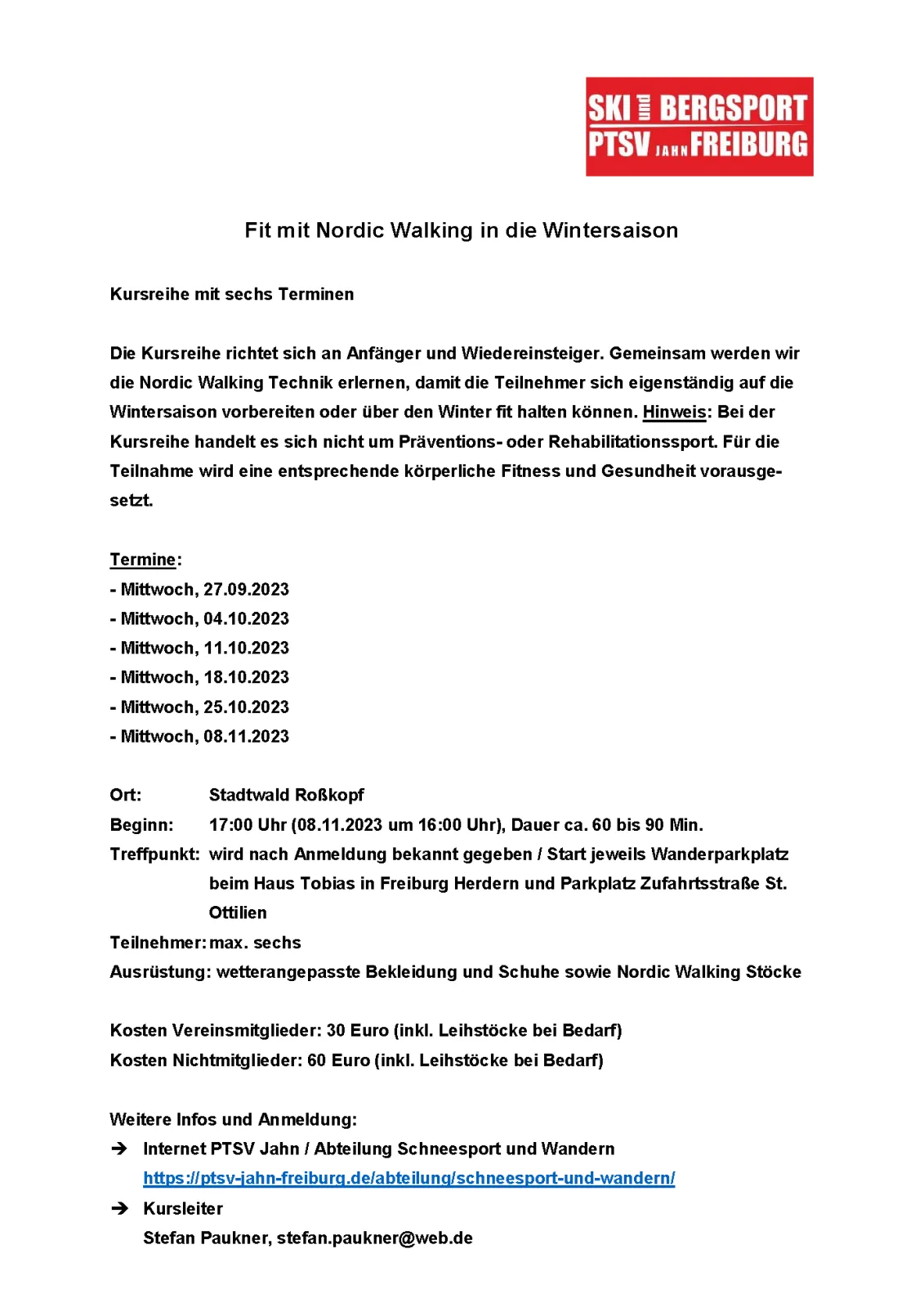 Fit mit Nordic Walking in die Wintersaison Autor Datum 18 July 2023 Abteilung Ski- und Bergsport Lesezeit Ca. 0 Fit mit Nordic Walking in die Wintersaison Bild News im Überblick - Alle - Billard Floorball Fußball Gesundheitssport Kegeln Kraftraum Kyudo Lacrosse Leichtathletik Ski- und Bergsport Tennis Tischtennis Turnen Ultimate Frisbee Volleyball Ski- und Bergsport Erste Hilfe am Berg Infoveranstaltung "Erste Hilfe am Berg" vom 16.1.2025 verpasst? Ski- und Bergsport Anmeldung Ski- und Snowboardkurse 2025 Bild Ski- und Bergsport Ski- und Bergsportabteilung Jahresprogramm 2025 Liebe Bergsportbegeisterte, wir stellen dir das Jahresprogramm 2025 für den Winter- und Sommer vor. Es ist für jeden etwas dabei. Ob Ski- und Snowboardkurse, Ski- und Schneeschuhtouren, Langlauf, Mountainbike, Wandern, Klettern, Hochtouren oder auch Theoriekurse, jeder findet etwas. Ski- und Bergsport Lehrgang Lawinenverschüttetensuche und Erste Hilfe am Berg Bild Ski- und Bergsport 19.-20.9.2024: Einfache Bergwanderung auf die Grimsel, Berneroberland/CH Jetzt ist die perfekte Wanderzeit. Wir fahren Richtung Grimselpass bis zum Berggasthaus Oberaar. Am Staussee beginnt eine einfache Wanderung (T2) bis zum Oberaargletscher. Das Gletschertor führt gerade viel Schmelzwasser und und die umliegenden Moränen laden ein den Gletscher von Nahe zu betrachten. Ski- und Bergsport Ski- und Bergsportabteilung Sommerprogramm 2024 Bild Paginierung Mehr laden