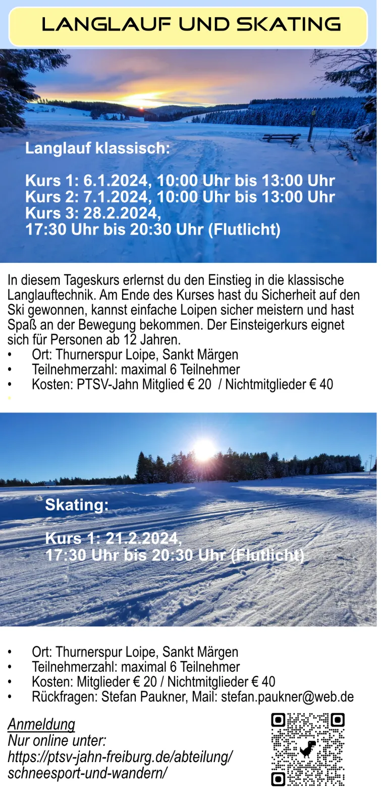 Langlauf und Skating 2024 Autor Datum 3 November 2023 Abteilung Ski- und Bergsport Lesezeit Ca. 1 Minute Langlauf und Skating 2024 Bild Tourenbeschreibung_Langlauf_klassisch_2024 Tourenbeschreibung_Skating_2024 Überblick des Schneesportprogramm 2024: Bild Bild News im Überblick - Alle - Billard Floorball Fußball Gesundheitssport Kegeln Kraftraum Kyudo Lacrosse Leichtathletik Ski- und Bergsport Tennis Tischtennis Turnen Ultimate Frisbee Volleyball Ski- und Bergsport Erste Hilfe am Berg Infoveranstaltung "Erste Hilfe am Berg" vom 16.1.2025 verpasst? Ski- und Bergsport Anmeldung Ski- und Snowboardkurse 2025 Bild Ski- und Bergsport Ski- und Bergsportabteilung Jahresprogramm 2025 Liebe Bergsportbegeisterte, wir stellen dir das Jahresprogramm 2025 für den Winter- und Sommer vor. Es ist für jeden etwas dabei. Ob Ski- und Snowboardkurse, Ski- und Schneeschuhtouren, Langlauf, Mountainbike, Wandern, Klettern, Hochtouren oder auch Theoriekurse, jeder findet etwas. Ski- und Bergsport Lehrgang Lawinenverschüttetensuche und Erste Hilfe am Berg Bild Ski- und Bergsport 19.-20.9.2024: Einfache Bergwanderung auf die Grimsel, Berneroberland/CH Jetzt ist die perfekte Wanderzeit. Wir fahren Richtung Grimselpass bis zum Berggasthaus Oberaar. Am Staussee beginnt eine einfache Wanderung (T2) bis zum Oberaargletscher. Das Gletschertor führt gerade viel Schmelzwasser und und die umliegenden Moränen laden ein den Gletscher von Nahe zu betrachten. Ski- und Bergsport Ski- und Bergsportabteilung Sommerprogramm 2024 Bild Paginierung Mehr laden