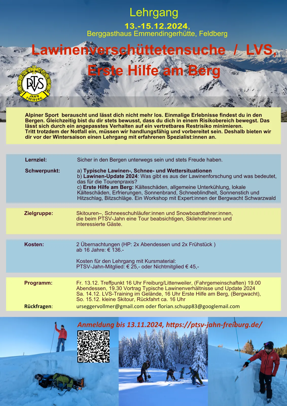 Lehrgang Lawinenverschüttetensuche und Erste Hilfe am Berg Autor Datum 5 September 2024 Abteilung Ski- und Bergsport Lesezeit Ca. 0 Lehrgang Lawinenverschüttetensuche und Erste Hilfe am Berg Bild Anmeldung News im Überblick - Alle - Billard Floorball Fußball Gesundheitssport Kegeln Kraftraum Kyudo Lacrosse Leichtathletik Ski- und Bergsport Tennis Tischtennis Turnen Ultimate Frisbee Volleyball Ski- und Bergsport Erste Hilfe am Berg Infoveranstaltung "Erste Hilfe am Berg" vom 16.1.2025 verpasst? Ski- und Bergsport Anmeldung Ski- und Snowboardkurse 2025 Bild Ski- und Bergsport Ski- und Bergsportabteilung Jahresprogramm 2025 Liebe Bergsportbegeisterte, wir stellen dir das Jahresprogramm 2025 für den Winter- und Sommer vor. Es ist für jeden etwas dabei. Ob Ski- und Snowboardkurse, Ski- und Schneeschuhtouren, Langlauf, Mountainbike, Wandern, Klettern, Hochtouren oder auch Theoriekurse, jeder findet etwas. Ski- und Bergsport Lehrgang Lawinenverschüttetensuche und Erste Hilfe am Berg Bild Ski- und Bergsport 19.-20.9.2024: Einfache Bergwanderung auf die Grimsel, Berneroberland/CH Jetzt ist die perfekte Wanderzeit. Wir fahren Richtung Grimselpass bis zum Berggasthaus Oberaar. Am Staussee beginnt eine einfache Wanderung (T2) bis zum Oberaargletscher. Das Gletschertor führt gerade viel Schmelzwasser und und die umliegenden Moränen laden ein den Gletscher von Nahe zu betrachten. Ski- und Bergsport Ski- und Bergsportabteilung Sommerprogramm 2024 Bild Paginierung Mehr laden