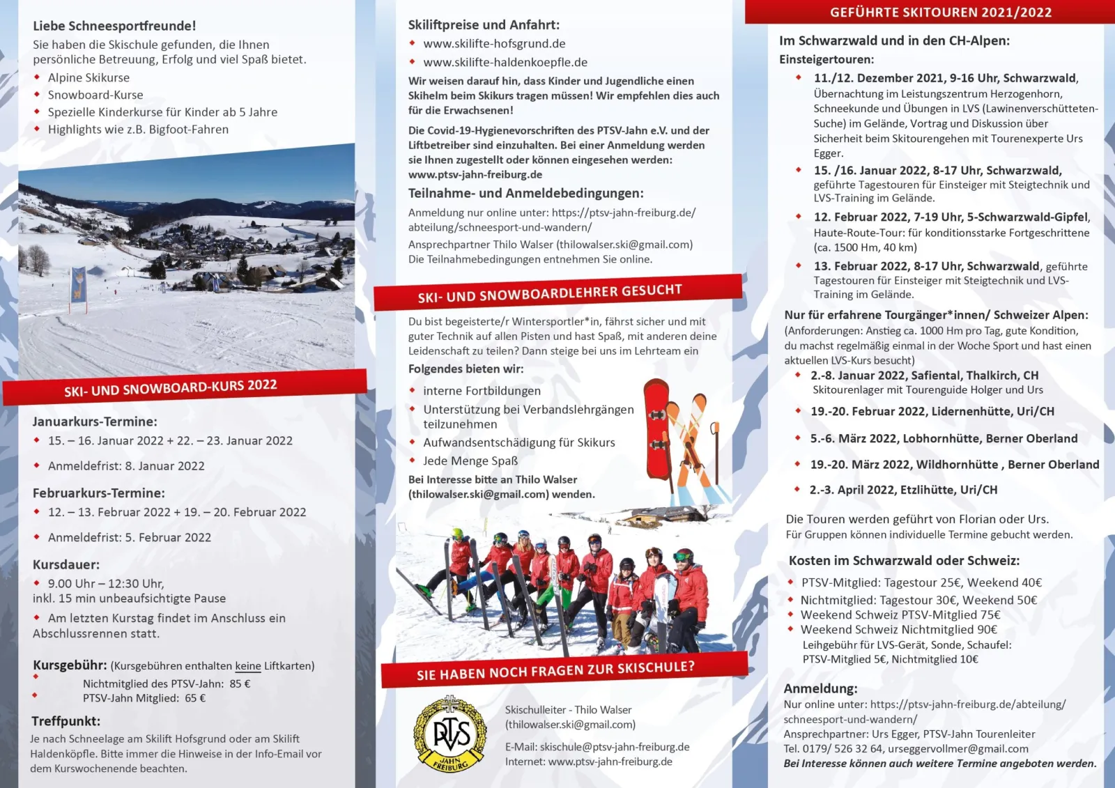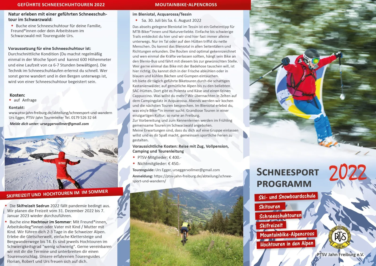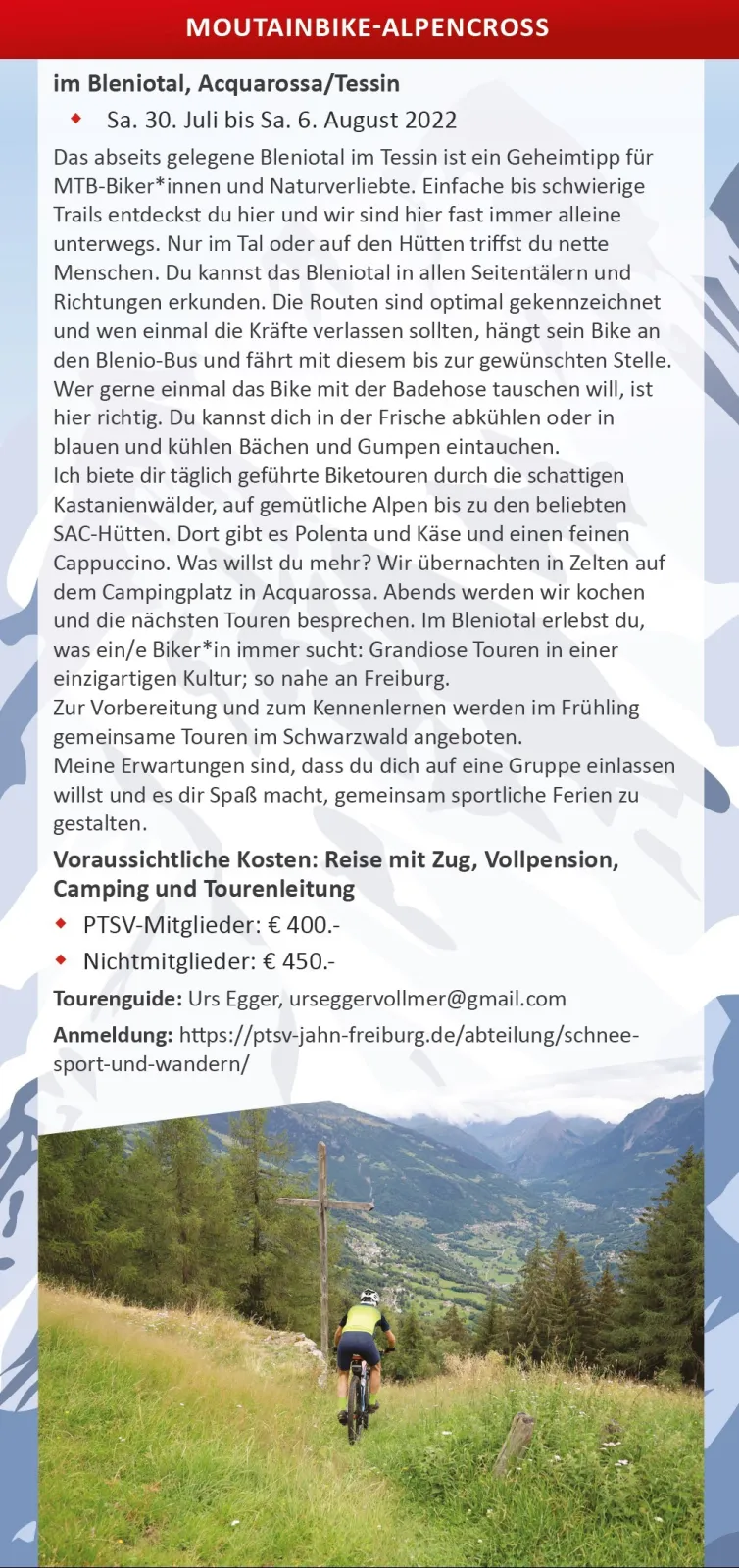 Moutainbike-Alpencross 2022 Autor Datum 1 March 2022 Abteilung Ski- und Bergsport Lesezeit Ca. 1 Minute Moutainbike-Alpencross 2022 Bild Das vollständige Winterprogramm 2022 Bild Bild oder ein Screenpaper: Wintersportprogramm 2022 News im Überblick - Alle - Billard Floorball Fußball Gesundheitssport Kegeln Kraftraum Kyudo Lacrosse Leichtathletik Ski- und Bergsport Tennis Tischtennis Turnen Ultimate Frisbee Volleyball Ski- und Bergsport Erste Hilfe am Berg Infoveranstaltung "Erste Hilfe am Berg" vom 16.1.2025 verpasst? Ski- und Bergsport Anmeldung Ski- und Snowboardkurse 2025 Bild Ski- und Bergsport Ski- und Bergsportabteilung Jahresprogramm 2025 Liebe Bergsportbegeisterte, wir stellen dir das Jahresprogramm 2025 für den Winter- und Sommer vor. Es ist für jeden etwas dabei. Ob Ski- und Snowboardkurse, Ski- und Schneeschuhtouren, Langlauf, Mountainbike, Wandern, Klettern, Hochtouren oder auch Theoriekurse, jeder findet etwas. Ski- und Bergsport Lehrgang Lawinenverschüttetensuche und Erste Hilfe am Berg Bild Ski- und Bergsport 19.-20.9.2024: Einfache Bergwanderung auf die Grimsel, Berneroberland/CH Jetzt ist die perfekte Wanderzeit. Wir fahren Richtung Grimselpass bis zum Berggasthaus Oberaar. Am Staussee beginnt eine einfache Wanderung (T2) bis zum Oberaargletscher. Das Gletschertor führt gerade viel Schmelzwasser und und die umliegenden Moränen laden ein den Gletscher von Nahe zu betrachten. Ski- und Bergsport Ski- und Bergsportabteilung Sommerprogramm 2024 Bild Paginierung Mehr laden
