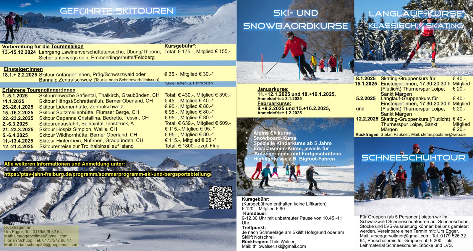 Liebe Bergsportbegeisterte, wir stellen dir das Jahresprogramm 2025 für den Winter- und Sommer vor. Es ist für jeden etwas dabei. Ob Ski- und Snowboardkurse, Ski- und Schneeschuhtouren, Langlauf, Mountainbike, Wandern, Klettern, Hochtouren oder auch Theoriekurse, jeder findet etwas. Ebenso haben wir ein schönes Familienprogramm in manchen Hochtouren integriert. Ihr dürft uns auch gerne für individuelle Touren mit einer Gruppe anschreiben. In diesem Sinne "Berg frei" und wir wünschen dir erlebnisreiche Aktivitäten in der Natur. Und nun ganz schnell anmelden! Die Anmeldung für die Ski- und Snowboardkurse erfolgt über folgenden Link: https://ptsv-jahn-freiburg.de/2024/11/04/anmeldung-ski-und-snowboardkurse-2025/ Fotos Skischule am Notschrei, 8.-9-2025 Die Skischule stellt sich kurz vor Video Skischule Notschrei, 8.-9.2.2025 Sportliche Grüße Dein Team der Ski- und Bergsportabteilung PTSV-Jahn Freiburg