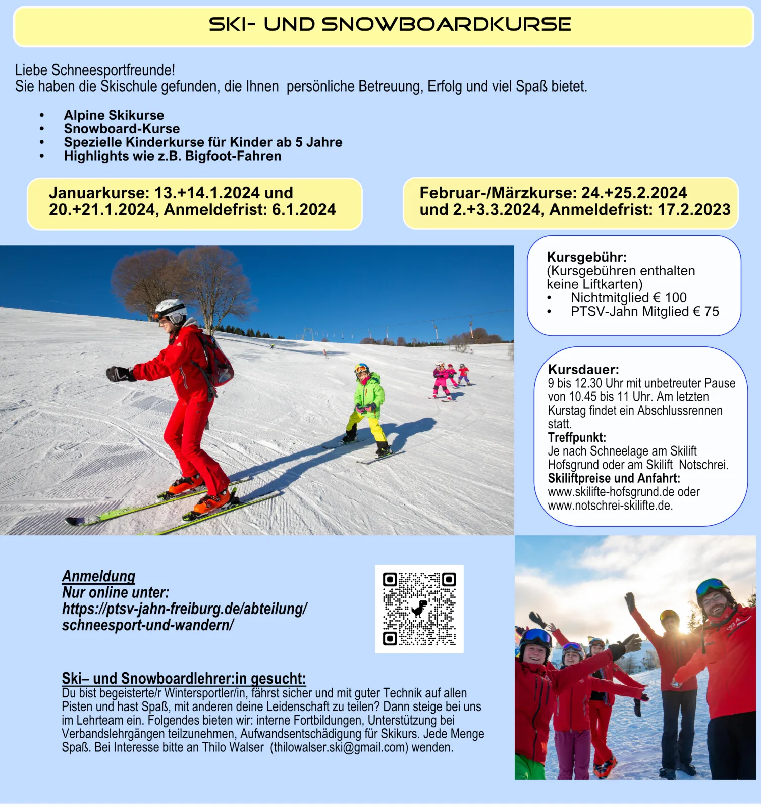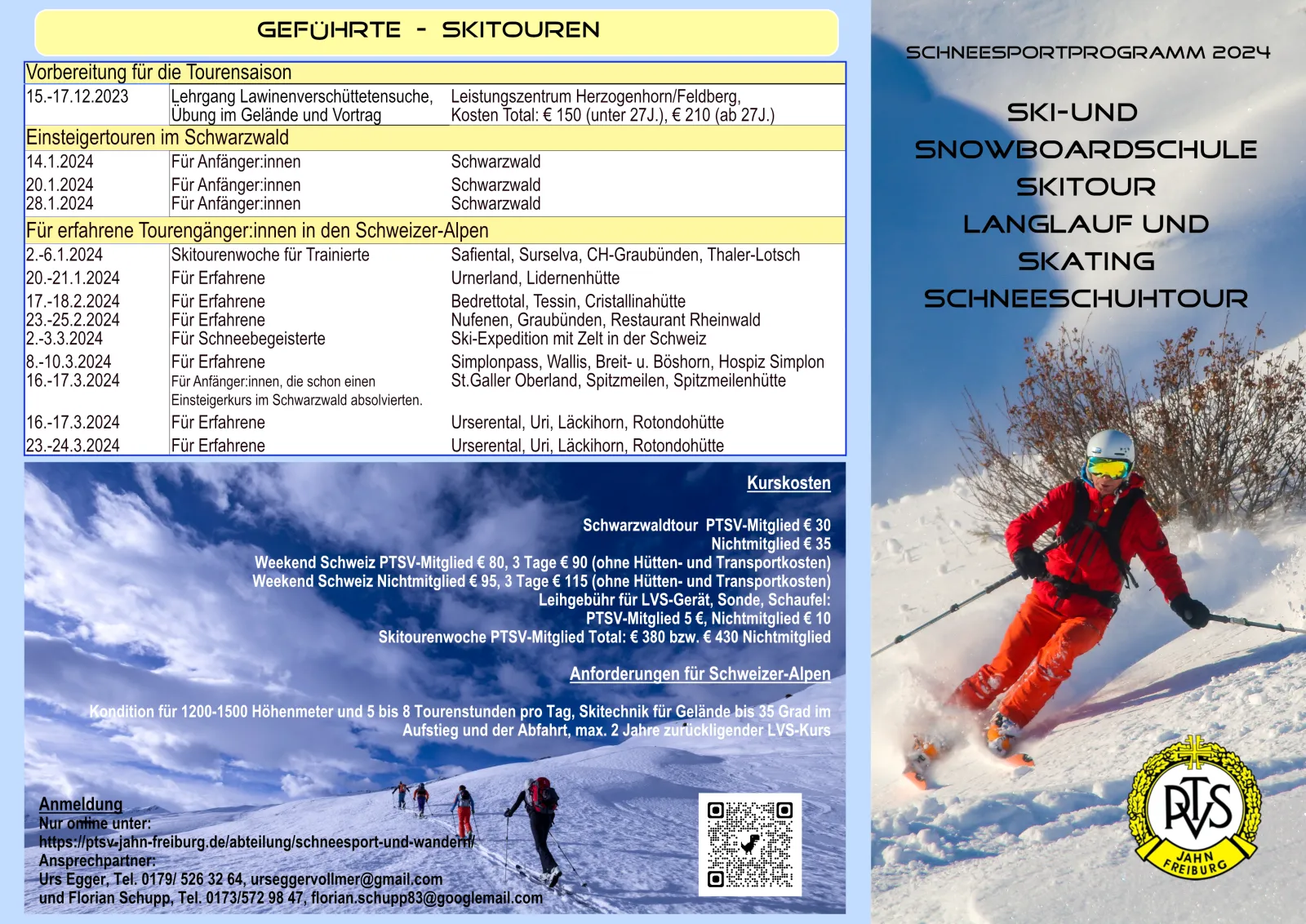 Ski- und Snowboard 2024 Autor Datum 12 November 2023 Abteilung Ski- und Bergsport Lesezeit Ca. 1 Minute Ski- und Snowboard 2024 Bild Durch Ausfüllen des folgenden Formulars melde ich mich verbindlich für den Januar- oder Februarskikurs an: Überblick des weiteren Schneesportprogrammes 2024: Bild Bild News im Überblick - Alle - Billard Floorball Fußball Gesundheitssport Kegeln Kraftraum Kyudo Lacrosse Leichtathletik Ski- und Bergsport Tennis Tischtennis Turnen Ultimate Frisbee Volleyball Ski- und Bergsport Erste Hilfe am Berg Infoveranstaltung "Erste Hilfe am Berg" vom 16.1.2025 verpasst? Ski- und Bergsport Anmeldung Ski- und Snowboardkurse 2025 Bild Ski- und Bergsport Ski- und Bergsportabteilung Jahresprogramm 2025 Liebe Bergsportbegeisterte, wir stellen dir das Jahresprogramm 2025 für den Winter- und Sommer vor. Es ist für jeden etwas dabei. Ob Ski- und Snowboardkurse, Ski- und Schneeschuhtouren, Langlauf, Mountainbike, Wandern, Klettern, Hochtouren oder auch Theoriekurse, jeder findet etwas. Ski- und Bergsport Lehrgang Lawinenverschüttetensuche und Erste Hilfe am Berg Bild Ski- und Bergsport 19.-20.9.2024: Einfache Bergwanderung auf die Grimsel, Berneroberland/CH Jetzt ist die perfekte Wanderzeit. Wir fahren Richtung Grimselpass bis zum Berggasthaus Oberaar. Am Staussee beginnt eine einfache Wanderung (T2) bis zum Oberaargletscher. Das Gletschertor führt gerade viel Schmelzwasser und und die umliegenden Moränen laden ein den Gletscher von Nahe zu betrachten. Ski- und Bergsport Ski- und Bergsportabteilung Sommerprogramm 2024 Bild Paginierung Mehr laden