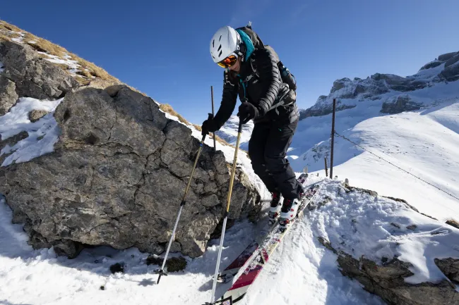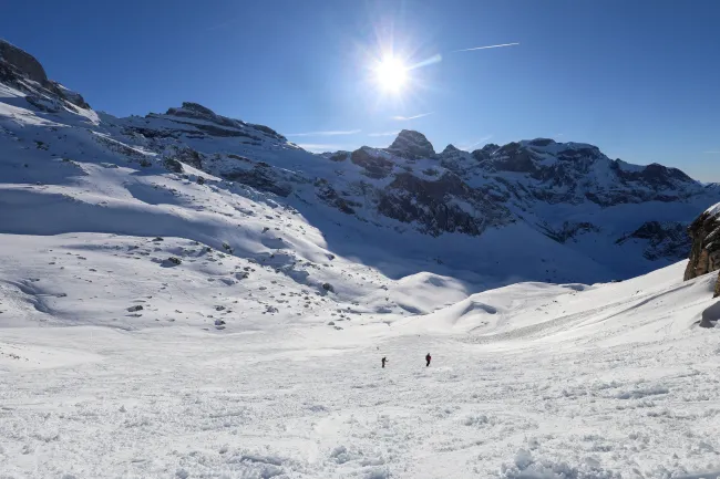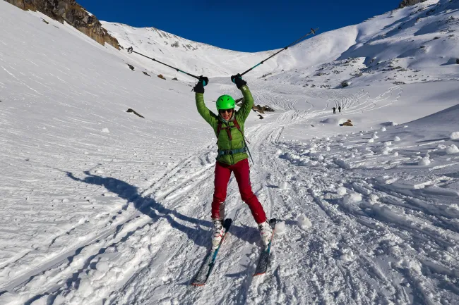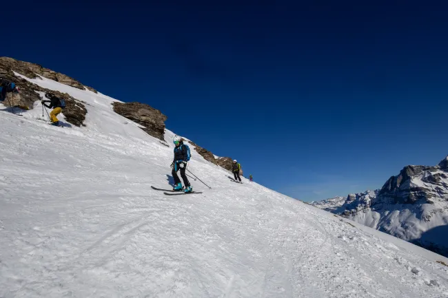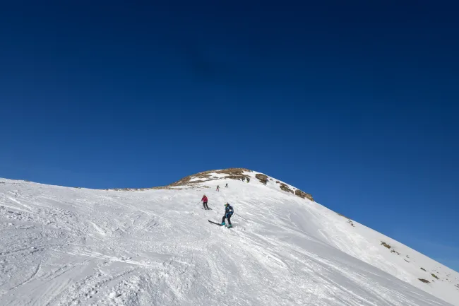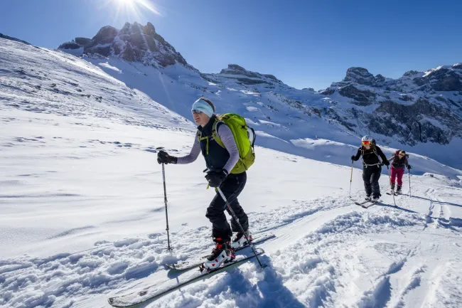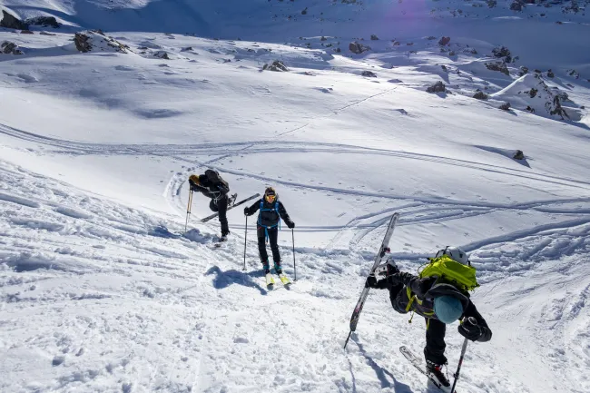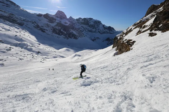 Kondition für einen Aufstieg von 700 Höhenmetern sowie eine solide Abfahrtstechnik im offenen Gelände. Tiefschnee-Perfektion ist nicht nötig, aber du solltest in unverspurtem Gelände bis 30 Grad kontrolliert und sicher abfahren können (siehe Fotogallerie).