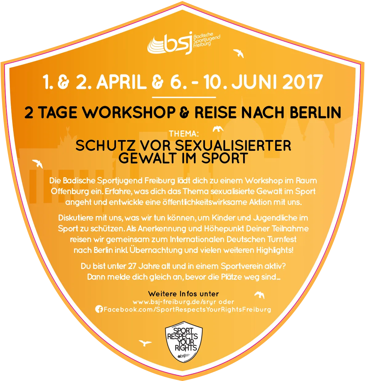 Voraussgesetzt ist die aktive Teilnahme am Workshop vom 01. und 02.04.2017 von „Sport Respects Your Rights“ (SRYR) in Offenburg. Hier diskutieren und gestalten wir gemeinsam, was wir tun können, um Kinder und Jugendliche im Sport gegen sexualisierte Gewaltformen zu schützen. Bringe deine Ideen zu diesem Thema mit ein und entwickle mit uns eine öffentlichkeitswirksame Aktion.Nach deiner Teilnahme am Workshop fährst du im Juni (06.06.-10.06.17) gemeinsam mit uns nach Berlin zum Jugendevent. Dort werden wir eine Aktion durchführen, beim Internationalen Deutschen Turnfest dabei sein und die Hauptstadt erleben.