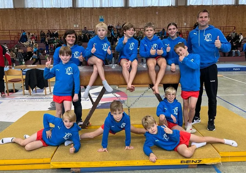 Mit viel Elan, Freude und dem nötigen Teamgeist meisterten die PTSV-Jungs den 4-Kampf an Barren, Sprung, Reck und Boden. Dabei erreichten die PTSV-Turner folgende Platzierungen: Vincent Jonke (Platz 27), Felix Uherek (Platz 22), Lukas Koßmann (Platz 19), Wim Sleifir (Platz 15), Anton Maier (Platz 11), Theo Burret (Platz 10), Noah Seifried (Platz 7) und Jani Sütterlin (Platz 6).